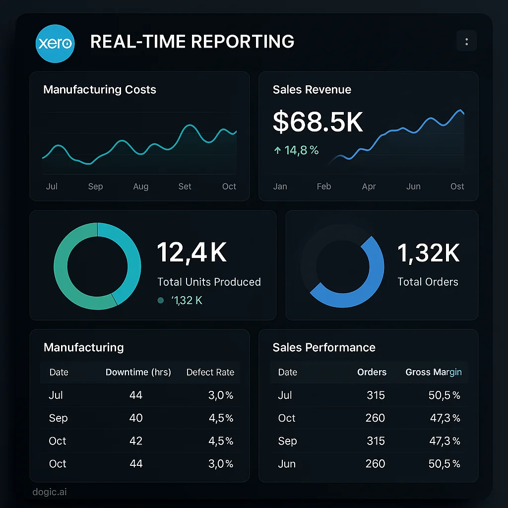 یکی از ویژگی‌های برجسته Xero، گزارش‌دهی لحظه‌ای است. به جای اینکه مدیران مجبور باشند تا پایان دوره مالی صبر کنند، می‌توانند در هر لحظه از وضعیت واقعی کسب‌وکار مطلع شوند — از موجودی حساب گرفته تا سود و زیان لحظه‌ای. این قابلیت برای صنایع تولیدی حیاتی است، زیرا آنها باید تصمیمات مرتبط با خرید مواد اولیه، افزایش ظرفیت تولید یا کاهش موجودی را بسیار سریع اتخاذ کنند.